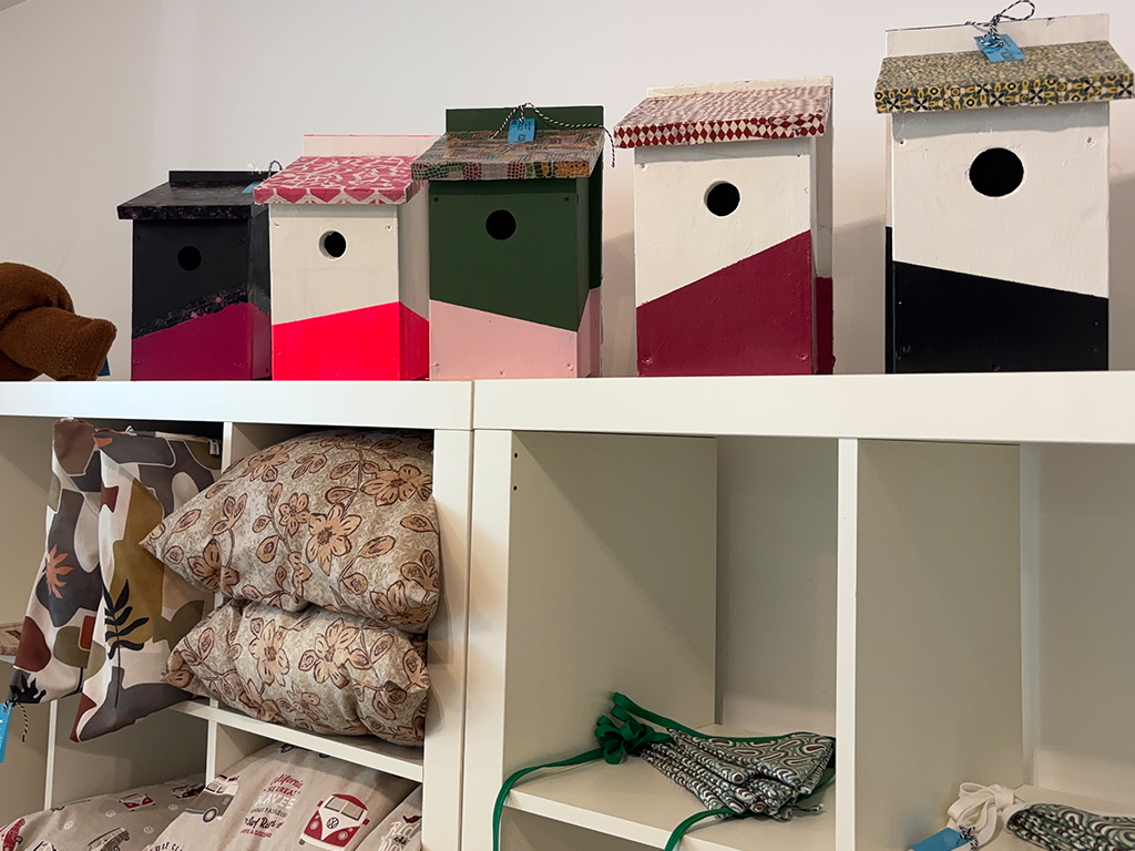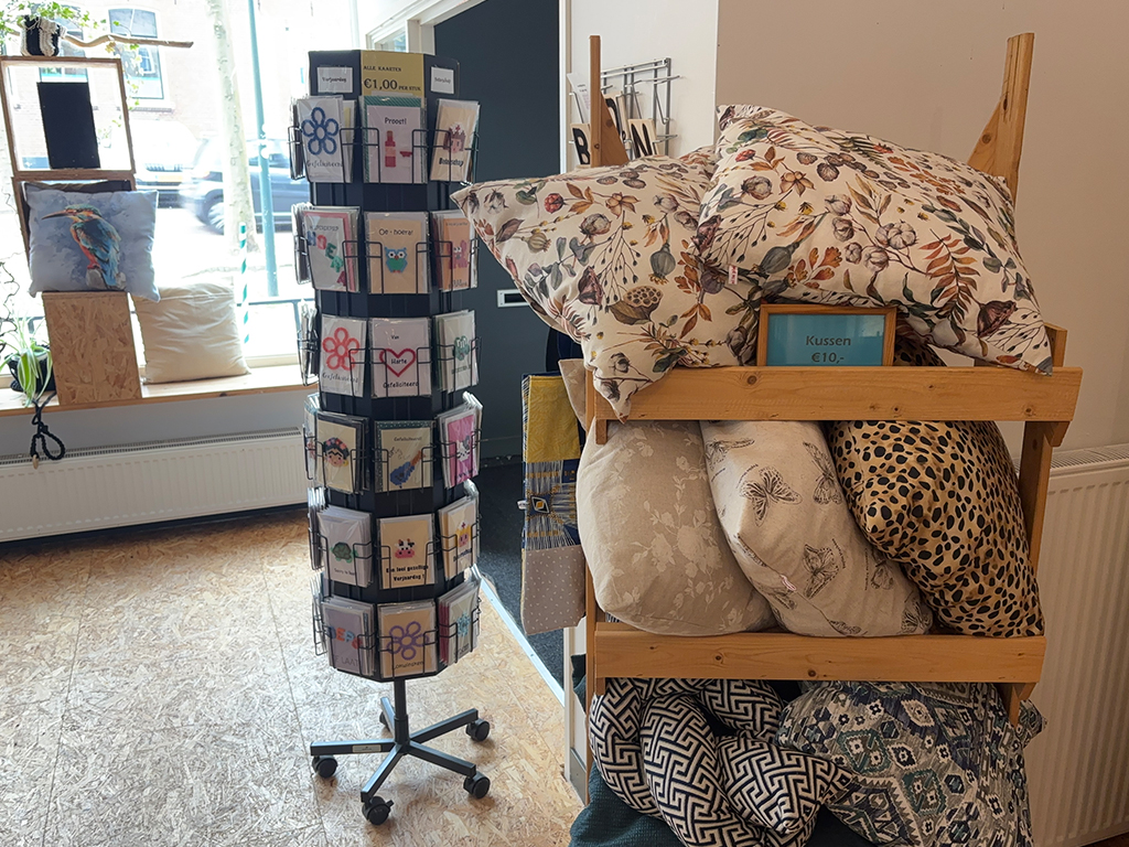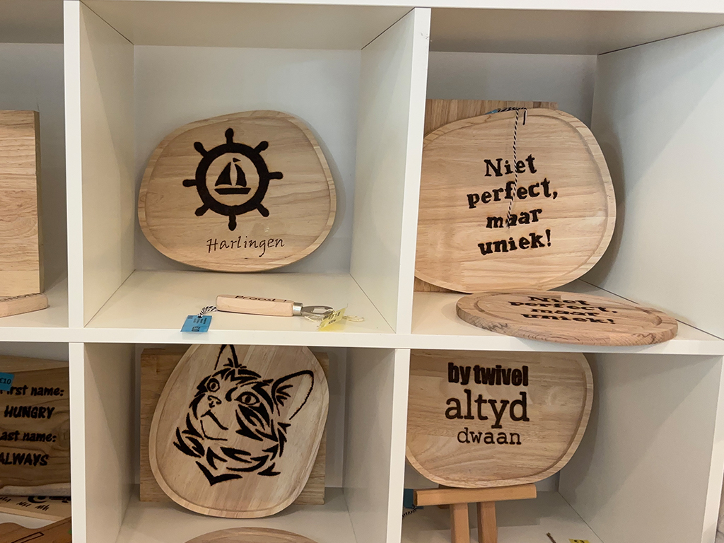 Kaarten, kussens, vogelhuisjes, slingers/vlaggetjes, pannenlappen, broodplanken en borrelplanken met tekst, veger en blik, bezems, haspel tafels en lappendekens en nog veel meer.